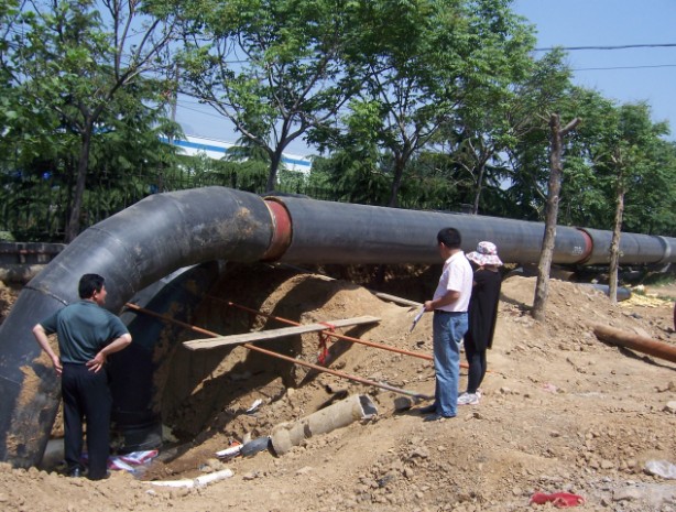 項目概述:2010年泰安市東城區(qū)循環(huán)水節(jié)能改造重點項目,本項目我們采用了預(yù)熱無補(bǔ)償直埋敷設(shè)施工技術(shù)。在供熱管道敷設(shè)方式中,直埋敷設(shè)因?qū)煌ㄓ绊懶?、便于施工及造價低等優(yōu)點被廣泛采用。其中,無補(bǔ)償直埋敷設(shè)是一種技術(shù)先進(jìn)且造價較低的敷設(shè)方式,它與有補(bǔ)償直埋敷設(shè)相比,突出的優(yōu)點在于大大減少了固定支座和補(bǔ)償器小室的數(shù)量,僅在管道變徑、較大管徑與不同敷設(shè)方式(如直埋敷設(shè)與地上敷設(shè))交界處設(shè)置固定支座,特別適用于地下管網(wǎng)復(fù)雜或地下水較高的地區(qū)。 本工程地點在市區(qū)內(nèi),施工難度大、工期緊,我們積極協(xié)調(diào)、加班加點,在當(dāng)年10月中旬圓滿完工,并且一次性試運(yùn)行成功,確保了采暖期的正常供熱。本工程主管網(wǎng)及分支管網(wǎng)共敷設(shè)管道70多公里,實現(xiàn)供熱面積達(dá)100多萬平方米。